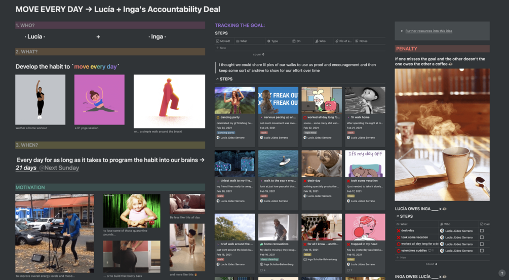 Do you wish you had some ally to turn up your accountability for the goals you set for yourself? Are you a solopreneur, creative or both and depend solely on yourself to get things moving and you think you can benefit from teaming up with someone else for accountability? This template is here to serve you so you can share it, set it up and start tricking your mind back with some accountability boost!